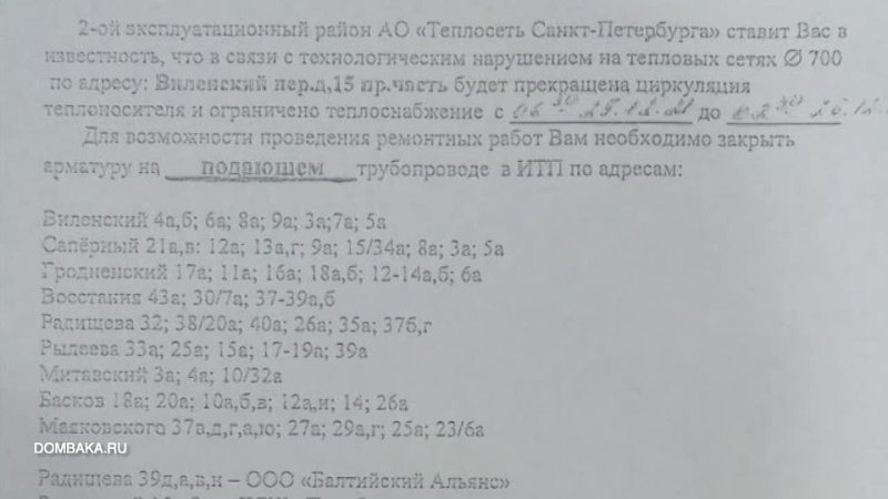 Снежное ЖКХ - караоке(музыкальные заметки)Посвящается:Петербургской метели.Вчерашнему прорыву на теплотрассе на Виленском переулке.ОАО «Теплосеть Санкт-Петербурга».УК «ЖКС-1 Центрального района».ФКР Санкт-Петербурга и его подрядчикам.Всем нашим соседям.Благодарим тех, кто справился с аварией. Просим службу 004 регистрировать заявки, а аварийную службу включать в число пострадавших все дома.По второму куплету, надеемся, что мансардные квартиры не будут больше мёрзнуть и все ответственные организации настроят ИТП и оборудование в квартирах так, чтобы соседям было тепло.Мы еще не пели.Слова написаны, запись и монтаж исполнены сообществом дома Бака.Оригинальная песня: "Снег кружится", музыка - Сергей Березин, слова Лидия Козлова.#Кирочная24 #домБака #галереиисторий #любимыйдом #авария #теплосети #жкс-1 #батарея #отопление #стояк #капремонт #фкр #снегкружится #музыкаСергейБерезин #словаоригиналаЛидияКозловаВидеозапись «Видео от Дом Бака. Галерея историй»: